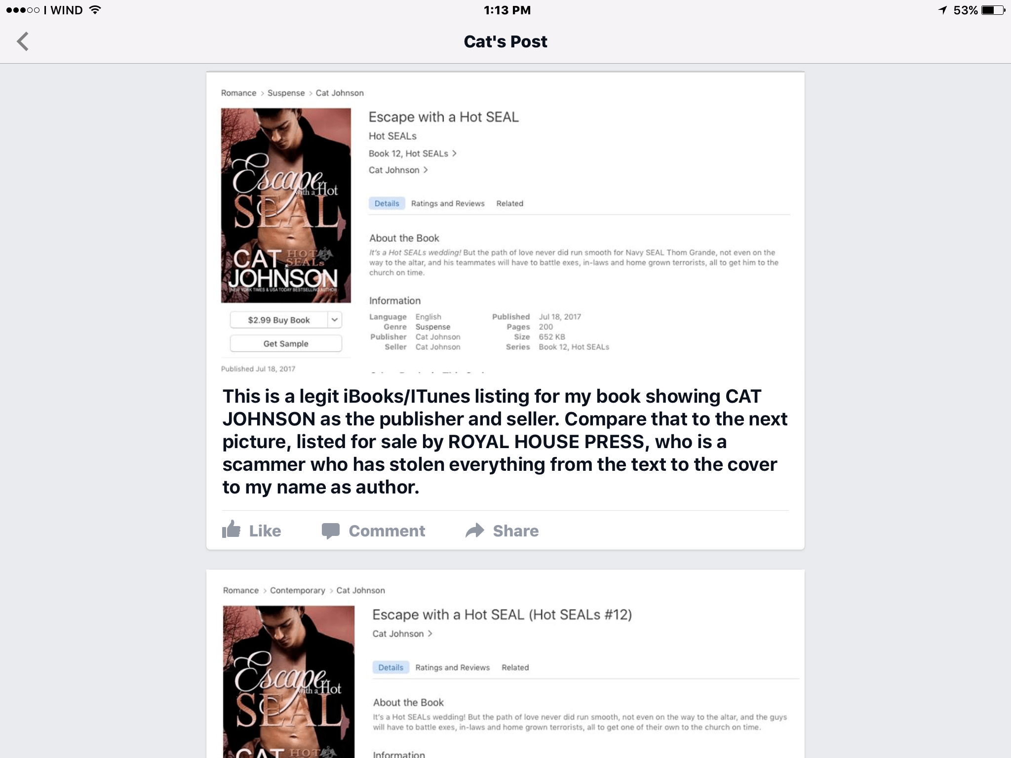 PIRATE WARNING! PLEASE SHAREThere has been a rash of fake publishers opening iBooks accounts, stealing our books and selling them there. Duplicate listings that are almost indistinguishable from the real listing. ALMOST indistinquishable… please look at the below. One listing is real and lists CAT JOHNSON as the publisher. The other is the stolen duplicate…