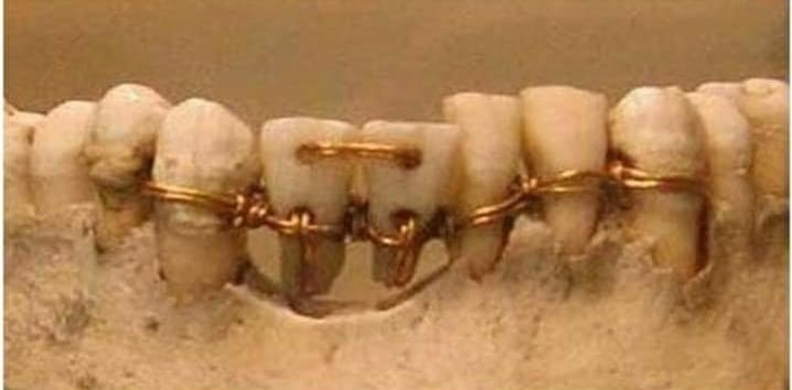 Incredible dental work found on a 4,000-year-old mummy. The two central teeth are donor teeth: this is the first bridge in history: not having some teeth was considered as unsightly in ancient times as it is today. And that is why the Egyptians devised a complicated method of installing bridges using gold threads intertwined between the teeth to keep the bridge in line….