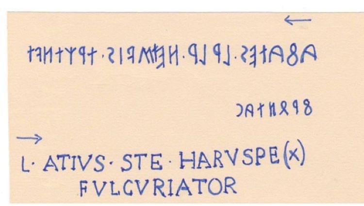 For completeness it should be noted that thanks to the text of a bilingual Etruscan Latin of Pesaro – “Laris Cafatius Larisis Filius Stellatina haruspe(x) fulguriator” = Laris Cafatio son of Laris of the (tribe) Stellatina haruspice/interpreter of lightning); “Cafates netśvis trutnvt frontac” = (Laris Cafatio (son) of laris haruspice and fulgural interpreter -, we know that the Etruscan name of the priest who interpreted lightning was frontac.