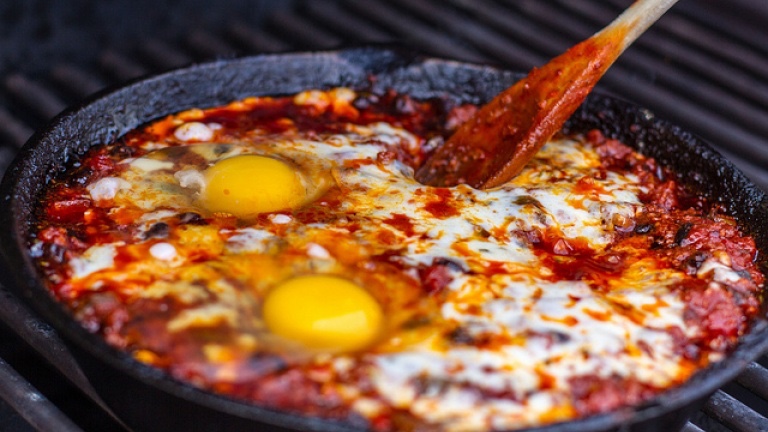 - Make four wells in the sauce and crack an egg into each well. Cover the skillet with a lid and cook for 5-7 minutes, or until the egg whites are set but the yolks are still runny.