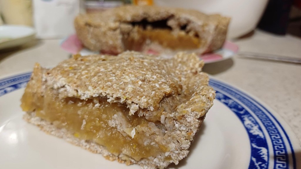 Fill with the apple puree and cover with the other half of the dough, still rolled out on baking paper.
