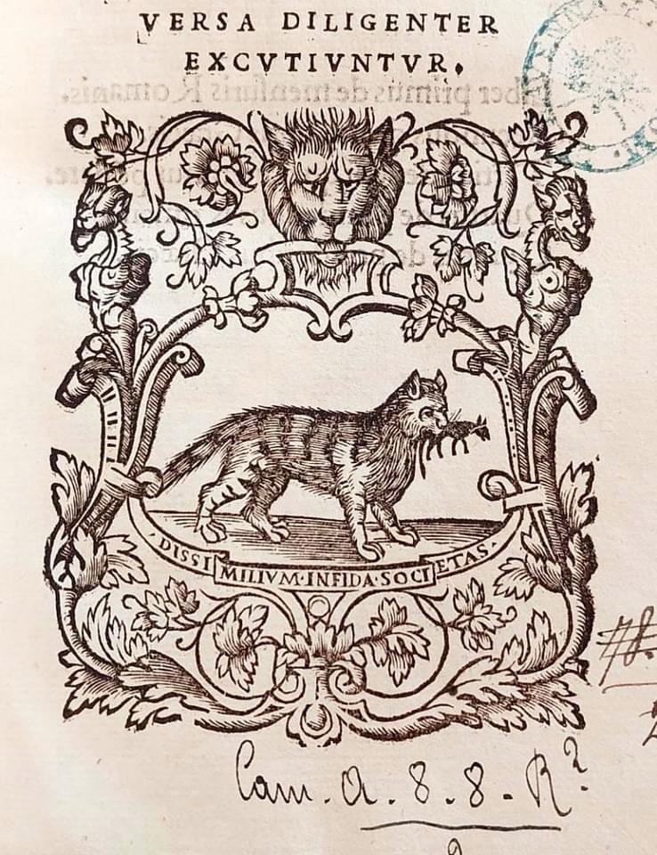Also ๐๐ฟ๐ฎ๐ป๐ฐ๐ฒ๐๐ฐ๐ผ ๐ง๐ฒ๐ฏ๐ฎ๐น๐ฑ๐ถ๐ป๐ถ, a bookseller-publisher from Brescia who started his publishing business in the 17th cent, was inspired for his own brand by the image of a cat with a mouse in its mouth, very similar to that of the Venetian Sessa, adding a slight variation in the construction of the motto: “Infidas Societas dissimilium.”