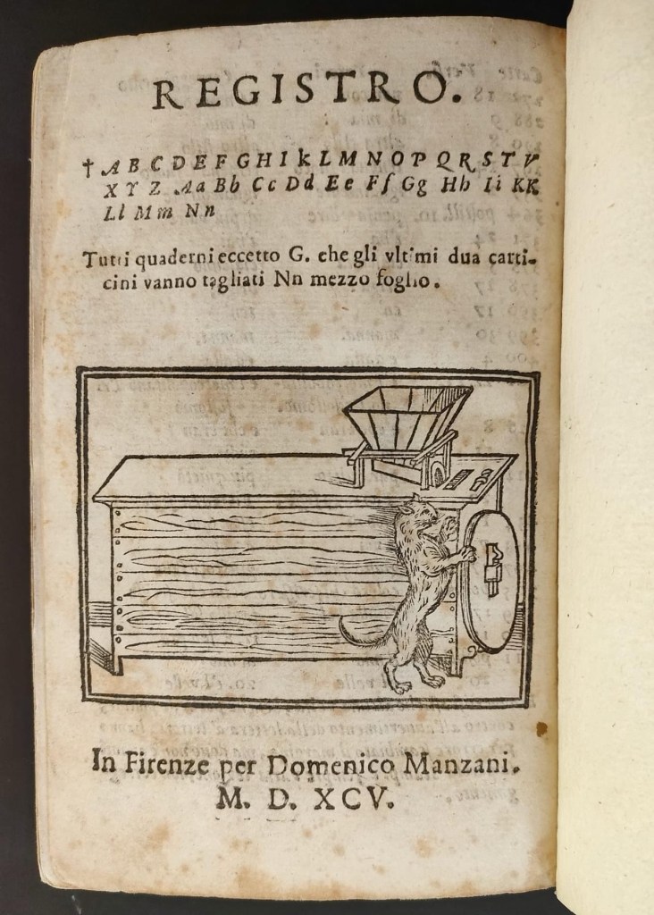 The various passages of this mixture can be seen in the 1595 edition of the Divine Comedy, which shows on the title page the Accademia’s traditional frullone, while the colophon depicts the typographical mark of the cat, which, contrary to the typical laziness of cats, here operates the frullone at a good pace.