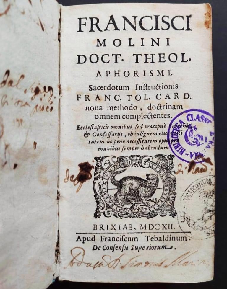 The title page of the work is reproduced here ๐๐ณ๐ข๐ฏ๐ค๐ช๐ด๐ค๐ช ๐๐ฐ๐ญ๐ช๐ฏ๐ช ๐ฅ๐ฐ๐ค๐ต. ๐ต๐ฉ๐ฆ๐ฐ๐ญ. ๐๐ฑ๐ฉ๐ฉ๐ฐ๐ณ๐ช๐ด๐ฎ๐ช. ๐๐ข๐ค๐ฆ๐ณ๐ฅ๐ฐ๐ต๐ถ๐ฎ ๐ช๐ฏ๐ด๐ต๐ณ๐ถ๐ค๐ต๐ช๐ฐ๐ฏ๐ช๐ด ๐๐ณ๐ข๐ฏ๐ค. ๐๐ฐ๐ญ. ๐ค๐ข๐ณ๐ฅ. ๐ฏ๐ฐ๐ถ๐ข ๐ฎ๐ฆ๐ต๐ฉ๐ฐ๐ฅ๐ฐ, ๐ฅ๐ฐ๐ค๐ต๐ณ๐ช๐ฏ๐ข๐ฎ ๐ฐ๐ฎ๐ฎ๐ฆ๐ฆ๐ฎ ๐ค๐ฐ๐ฎ๐ฑ๐ญ๐ฆ๐ค๐ต๐ฆ๐ฏ๐ต๐ฆ๐ด (1612), where we see the mark with cat passing by with its head in frontal view and a mouse in its mouth. Motto: “Dissimilium infida sotietas.”