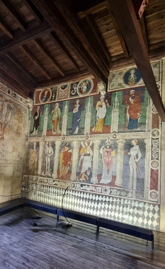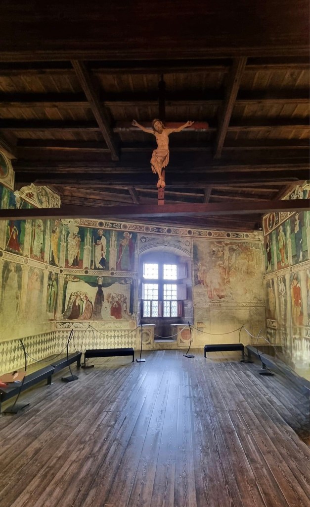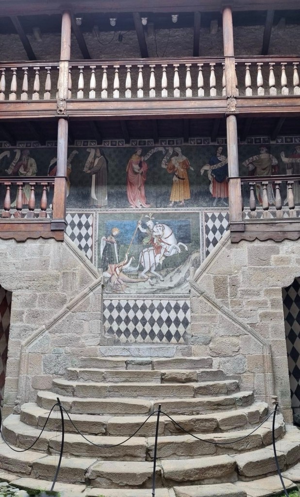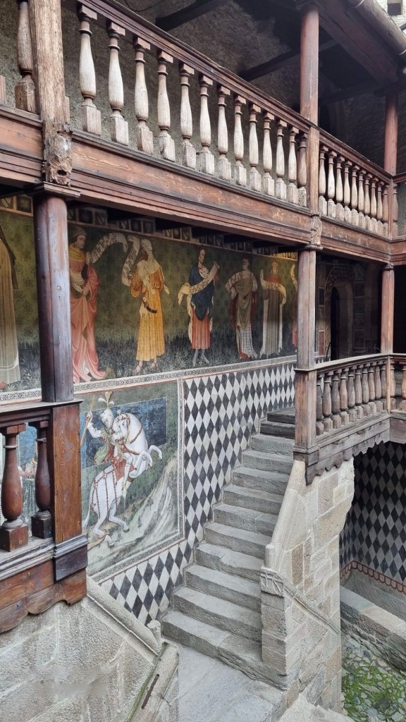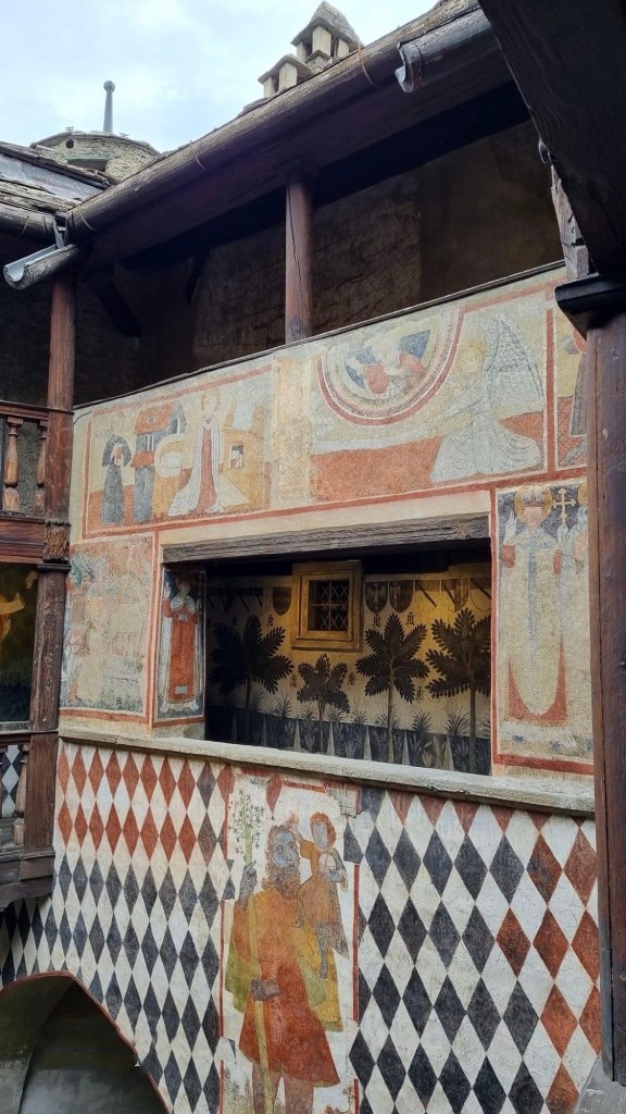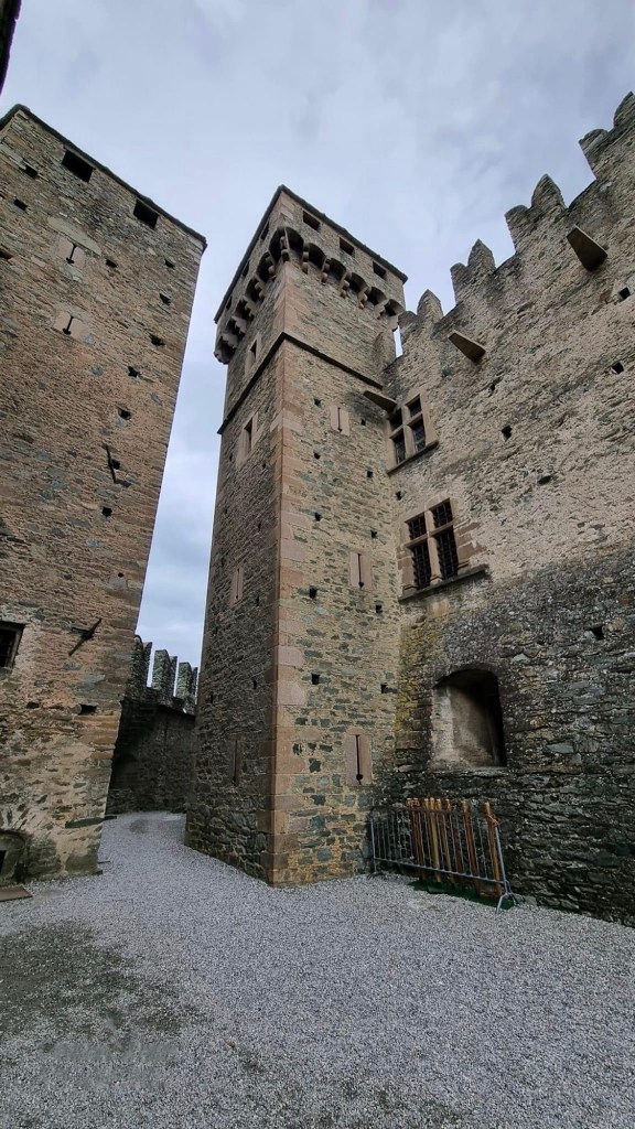 The Castello di Fénis is one of the most famous and well-preserved medieval castles in the Aosta Valley, in the northwest of Italy. Unlike many castles that were built for military purposes, the Castello di Fénis is renowned for its architectural beauty and its richly decorated interiors, which include medieval frescoes.