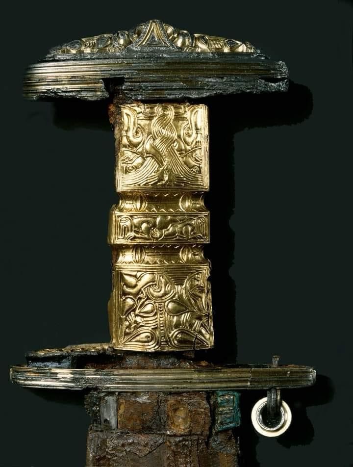 In addition to the sword, the tomb contained a complete weapon set, a silver-mounted glass beaker, a bronze kettle, a gold ring, a bowl weight of bronze, three weights of lead, rare patterned fabrics, and bear claws. This discovery provoked international attention and is referred to as “The loveliest migration time grave find to this day that was dug up on Norwegian soil”.