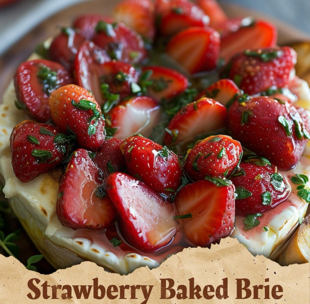 - Now, it’s showtime! Place your warm, gooey brie on a plate or a serving dish and spoon that delicious strawberry mixture on top. Sprinkle it with your torn basil leaves.