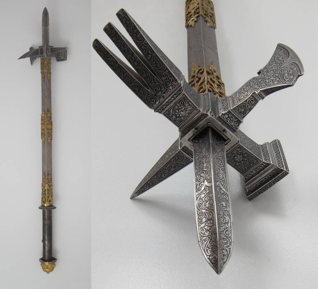 The War Hammer from 16th century Germany is an impressive piece of weaponry, showcasing the craftsmanship and martial innovation of the period. Characterized by a robust hammerhead designed to crush armor and a sharp spike for piercing, this weapon was both a practical tool in battle and a symbol of the era’s evolving combat techniques. The intricate design and construction reflect the blend of functionality and artistry typical of German arms and armor from that time.